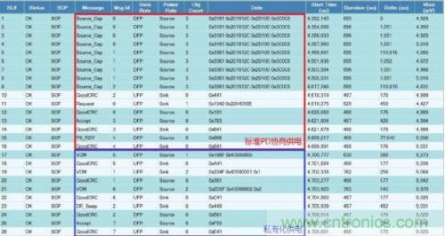 為了更加有效開發(fā)和準確驗證基于控制流程的協(xié)議溝通,本文采用賽普拉斯研發(fā)的PD協(xié)議分析儀CY4500 EZ-PD™ Protocol Analyzer。CY4500 協(xié)議分析儀通過抓取配置通道(CC,Configuration Channel)上的數(shù)據(jù)包,并通過USB接口發(fā)送到主機端,通過軟件EZ-PD Analyzer Utility解碼并顯示PD協(xié)議包。CY4500不僅可以實時顯示并解析PD通信包,而且還實時測量電力傳輸過程中的電壓和電流值,進而縮短了開發(fā)周期,對于調(diào)試以及兼容性測試幫助非常大。