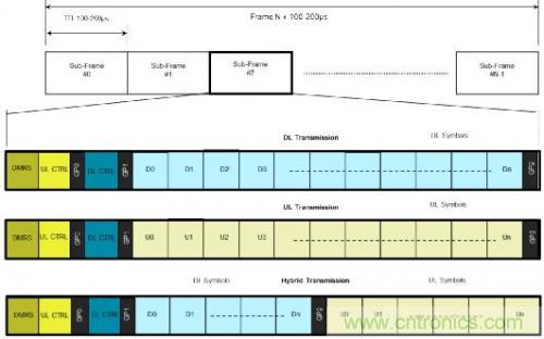 將端到端時延減小到 1ms 以內(nèi)是 5G 的另一個重要目標(biāo),旨在滿足任務(wù)關(guān)鍵型應(yīng)用的超高可靠低時延用例,以及擴展的移動寬帶用例(諸如承諾為服務(wù)提供商帶來更高收入的游戲)的要求。5G 正在改進幀結(jié)構(gòu)以實現(xiàn)上述這一目標(biāo)。圖 1 給出一種準(zhǔn) 5G 標(biāo)準(zhǔn)幀結(jié)構(gòu)方案。該方案具有 100-200 微秒級的很短的傳輸時間間隔(TTI),比 4G LTE 的 TTI(1ms)縮短 10 倍,具備快速的 Hybrid ARQ(自動重發(fā)請求)確認(rèn),可縮短系統(tǒng)時延。利用前載解調(diào)制參考和控制信號,可在接收幀的期間執(zhí)行幀處理,而不是等緩沖整個子幀之后再處理。幀結(jié)構(gòu)還用來簡化和加速每子幀的快速調(diào)度請求。因此,5G 基帶所需的計算與 4G LTE 系統(tǒng)相比會顯著增加。