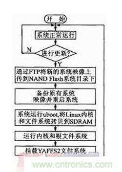 本設(shè)計(jì)對uboot和Linux內(nèi)核進(jìn)行改造,使其支持YAFFS2文件系統(tǒng),對系統(tǒng)添加ftp、telnet等應(yīng)用服務(wù)。系統(tǒng)更新流程如圖2所示。系統(tǒng)正常運(yùn)行時(shí)管理人員可以通過telnet遠(yuǎn)程登錄到嵌入式終端進(jìn)行監(jiān)控和管理。當(dāng)需要對系統(tǒng)進(jìn)行更新時(shí),通過遠(yuǎn)程管理系統(tǒng)的ftp客戶端登錄到嵌入式終端,將需要更新的內(nèi)核映像和文件系統(tǒng)上傳到NAND Flash。上傳完畢后對原有的內(nèi)核映像和文件系統(tǒng)進(jìn)行備份并重啟系統(tǒng)。系統(tǒng)重啟后uboot將NAND Flash中更新后的內(nèi)核映像和文件系統(tǒng)搬運(yùn)到SDRAM中,然后跳轉(zhuǎn)到SDRAM中啟動(dòng)Linux系統(tǒng),掛載YAFFS2文件系統(tǒng),啟動(dòng)各種應(yīng)用服務(wù)。