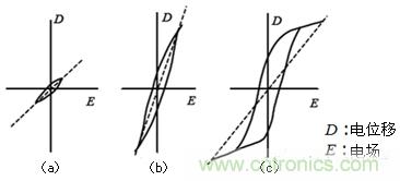 如上所述,鐵電體陶瓷的結(jié)晶粒(Grain)有分域(Domain),各個(gè)自發(fā)極化(Ps)的方向是隨機(jī)的,整體上相當(dāng)于無(wú)極化的狀態(tài)。在此之上施加電場(chǎng)(E)時(shí),電場(chǎng)方向上產(chǎn)生極化,達(dá)到飽和值。在這種狀態(tài)下即使去除電場(chǎng),極化方向也不會(huì)回到原來(lái)無(wú)序隨機(jī)的狀態(tài),多少會(huì)停留在極化時(shí)的狀態(tài)上,形成殘留極化,在外部顯現(xiàn)。為了讓這種殘留極化歸零,需要反方向的電場(chǎng)。逆電場(chǎng)進(jìn)一步增強(qiáng)時(shí)會(huì)發(fā)生極化反轉(zhuǎn),向相反方向進(jìn)行極化。類似這樣的因外部電場(chǎng)而引起的鐵電體的極化動(dòng)作如圖4的D-E歷史曲線(磁滯曲線)。