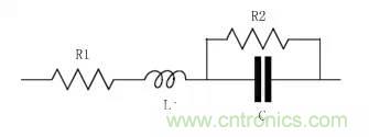 片狀電容在射頻電路中的應用十分廣泛,它可以用于濾波器調頻、匹配網絡、晶體管的偏置等很多電路中,因此很有必要了解它們的高頻特性。電容的高頻等效電路如圖所示,其中L為引線的寄生電感;描述引線導體損耗用一個串聯的等效電阻R1;描述介質損耗用一個并聯的電阻R2。
