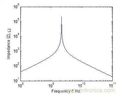 同樣可以得到一個典型的電容器的阻抗絕對值與頻率的關系。如下圖所示,由于存在介質損耗和有限長的引線,電容顯示出與電阻同樣的諧振特性。