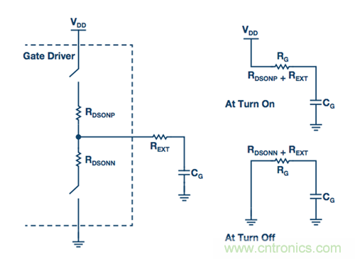 RDS(ON)是柵極驅(qū)動器最大驅(qū)動強度額定值的真正基礎(chǔ),因為它限制了驅(qū)動器可以提供的柵極電流。內(nèi)部開關(guān)的RDS(ON)決定灌電流和拉電流,但外部串聯(lián)電阻用于降低驅(qū)動電流,因此會影響邊沿速