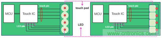 從LED驅動的角度,比較二者的異同。通常,觸控 IC內置了LED Driver。如果應用方案中需要使用LED表示觸控動作的有/無,并且應用產品的結構設計,要求LED緊鄰觸控電極,如圖5所示,那么使用觸控 IC更方便PCB的Layout。