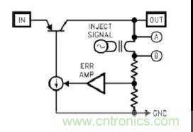 環路的不穩定來自于相位移量,我們可以在反饋回路中通過變壓器注入正弦小信號,如下圖所示,Loop Gain=Va/Vb,從Vb傳入交流小信號,同過回路產生相移到達Va。這樣可以計算回路增益,相位的偏移量。(此處以LDO分析)