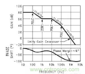 假設直流增益為80dB(10-100Hz處的增益),100到1KHz增益減少了20dB,10K-100KHz增益減少20dB,100K-1MHz增益減少40dB(斜率有-20dB/10倍頻的變化)。圖中可以看出有3個POLE,一個ZERO。1MHz處的增益是0dB,說明1MHz的小信號在此截止,此回路的帶寬就是1MHz。