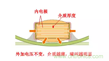 陶瓷介質是MLCC主要組成部分,電壓作用下,電致伸縮不可避免。如電致伸縮強烈表現為壓電效應,則會產生振動。