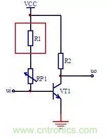 電阻R1用來限制電路中電流,防止可變電阻器阻值調(diào)到最小時,使得三極管VT1基極電壓等于電源電壓VCC,那樣會因為VT1基極電流太大而損壞VT1,這種電阻在電路中一般稱為保護電阻。