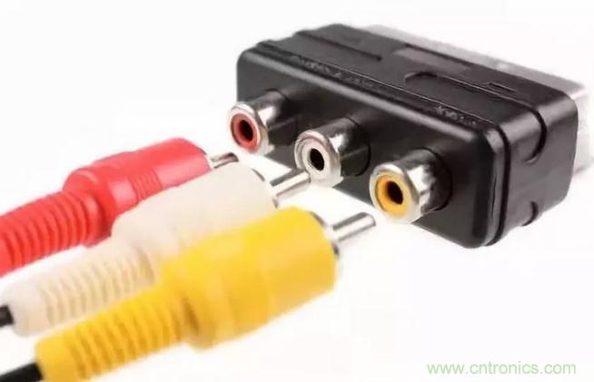 復合視頻接口是最基本的視頻連接器接口,過去主要用于家用視頻設備。這種接口常見于老款電視機、VCR和家用游戲機,線和端子都是黃色。因為對YUV三種源信號(Y:亮度,U/V:顏色)進行同步復合(composite),所以稱為復合視頻。在同一個信道(line)傳輸亮度和顏色信號,所以畫質遠不如后來出現的其他接口標準。復合視頻接口輸出的視頻分辨率最高可達SD(—standard definition)級,也就是480i(NTSC)或576i(PAL)。模擬視頻連接器通常不包含音頻信號,因此如上圖所示,需要單獨的音頻線。一般用白色(左)和紅色(右)兩個連接器傳輸立體聲信號。