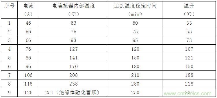 取8芯電連接器1套,接觸體壓接16mm2導(dǎo)線,送入后將所有孔位串聯(lián),通以額定電流,當(dāng)電連接器內(nèi)部溫度穩(wěn)定后,逐步增加電流值,直至溫度超過電連接器承受能力。試驗結(jié)果見表2: