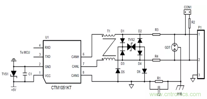 前面只是對ESD的作用機理進行了分析,但隨著工業產品對通信接口的EMC等級要求越來越高。許多應用要求滿足IEC61000-4-2靜電放電4級,IEC61000-4-5浪涌抗擾4級要求。一般的收發器ESD、浪涌的防護等級均比較低,如CTM1051M隔離CAN收發器的隔離耐壓為2500VDC,裸機情況下,ESD、浪涌等級均較低。所以有必要增加外圍電路,提高通信端口的EMC等級。