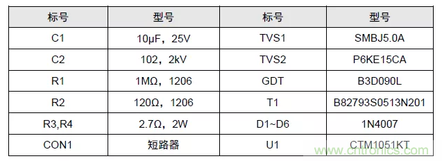 以CAN總線為例,上圖為完善的外圍推薦電路。其中GDT置于最前端,提供一級防護,當雷擊、浪涌產生時,GDT瞬間達到低阻狀態,為瞬時大電流提供泄放通道,將CAN_H、CAN_L間電壓鉗制在二十幾伏范圍內。實際取值可根據防護等級及器件成本綜合考慮進行調整,R3 與 R4 建議選用 PTC,D1~D6 建議選用快恢復二極管,參數表如下。