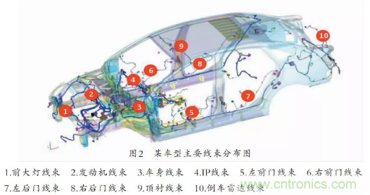 隨著車輛安全、智能、舒適性的發展,傳感器、攝像頭及ECU占據了一定的空間,從而造成線束的布置空間越發狹小,同時功能的增加意味著導線數量及體積不斷增大。整車可裝拆性、運輸便利性等也對線束提出了更高的要求。下圖2 是上汽通用某車型的線束發布圖, 為便于運輸和裝配,將整車線束切割成11個部分。