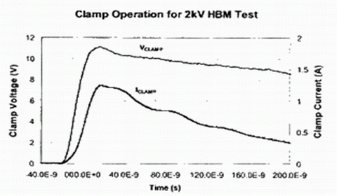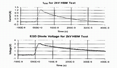 大電流在ESD二極管和引線上產生I-R壓降,該電壓高于二極管本身的壓降。IC可靠性報告中給出了器件設計所能承受的ESD測試電壓。