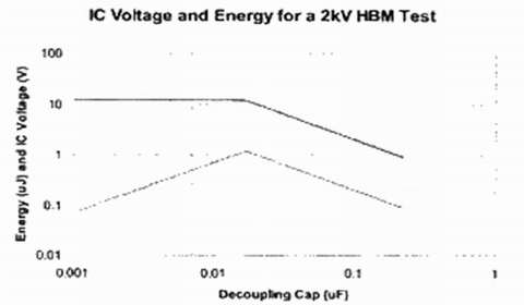 對于一個給定的去耦電容,ESD測試中初始電壓的變化遵循電荷守恒。例如,使用一個0.01μF去耦電容,2kV HBM測試電壓可以達到20V。