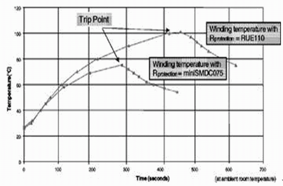 選擇PPTC元件時,需要考慮可以通過的最大負荷電流、最高的環境溫度(通常為45℃)以及由變壓器溫度上升速率所決定的的最大動作時間。