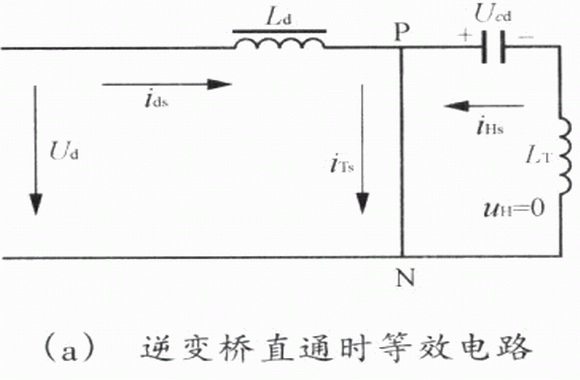 在負載短路時,逆變橋囚侵入干擾信號而產生直通短路,逆變橋輸入電壓突降為零。這時,原來儲藏在濾波電感Ld中的磁能和隔直電容Cd中的電能均分別以短路電流ids和iHs的形式向逆變電路釋放,等效電路圖為圖2(a)所示。橋中IGBT流過的短路電流is為