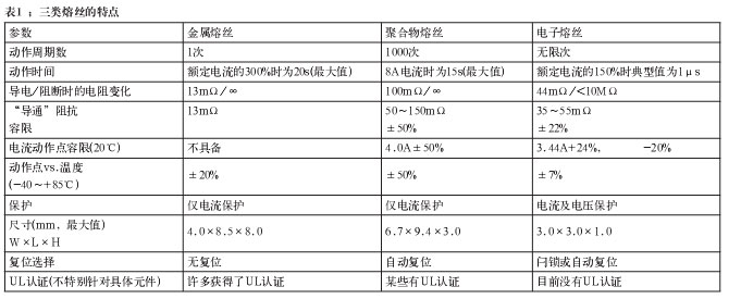 聚合物器件以導電型塑料制成,這些器件在電流(內部熱量)達到預設定的電平時會改變它們的阻抗。這些器件也經常與TVS器件一起使用,就像金屬熔絲那樣。電子熔絲是半導體電路,控制功率開關(通常是功率MOSFET),并按照預設的參數改變其阻抗。表1簡單比較了這三類熔絲。