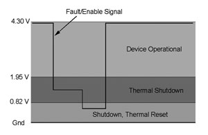 圖5顯示的是這電路的信號電平,而圖6顯示的是等效原理圖。在正常工作中,內部電流源將啟用引腳上拉至4.3V。如果發生熱故障,由于過大直流電流、限流或過壓保護原因,這器件將關閉,熱邏輯將把這信號下拉至1.6V電平。