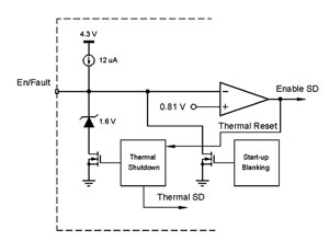 啟用電路使用戶能夠控制器件,并在發生熱關閉時提供信號。這是一種三態信號,同時發送及接收信息,能夠監測這信號以檢測芯片的狀態。如果用戶選擇不用這個引腳,它只需保留在開路狀態,器件會自己控制。