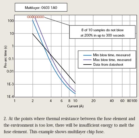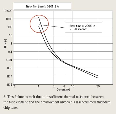 若熔斷元件和環境間的熱阻抗過低,將沒有足夠能量融化熔斷元件。這將使保險絲不能在120秒內切斷相當于額定電流兩倍的過載電流。圖2和圖3說明了多層片式保險絲以及激光調割厚膜芯片保險絲的這種情況。
