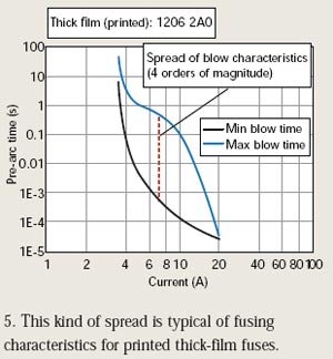 源于這種阻值變化,芯片保險絲可能在正常浪涌電流條件下熔斷。或反過來說,它也可能在過載條件下需要熔斷時而沒能熔斷。當然,這是工程師必須避免的最壞情況。圖5顯示了印刷厚膜保險絲熔斷特性的典型擴散。