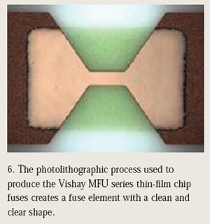 采用光刻技術,可以與控制濺射薄膜層厚度相同的準確度和精度對熔斷元件的長度和寬度施加控制。圖6顯示了如何采用光刻工藝制造Vishay的MFU系列薄膜芯片保險絲,制成的熔斷元件具有整潔和清晰的形狀。