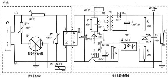 陶瓷氣體放電管的通流容量根據要求的通流容量選擇,電路采用3RM470L-7.5-L,通流量為5000A。線繞電阻R1起限流分壓作用;貼片整流模塊為開關電源電路前端整流作用,C1為高壓濾波電容,Y1為去耦電容,電阻R2和電容C2及VD2組成開關電源芯片MOS管的吸收鉗位電路,保護芯片,開關電源芯片采用PI公司的TNY27系列,TR1為高頻變壓器,VD3、C3構成高頻變壓器次級濾波,U2、VD4、R3、R4、R5構成開關電源電路的反饋電路,可將變壓器次級輸出電壓穩定在設計值,此防雷抗浪涌電路在實際使用中取得了較好的效果。