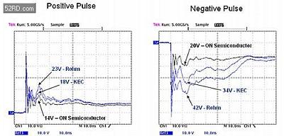 從圖3所示的圖上可見,顯然,與兩個競爭對手的器件(藍色波形)相比較,安森美半導體保護解決方案(黑色波形)可提供更低的ESD脈沖箝位電壓。與KEC的18V和Rohm的23V相比較,安森美的器件將正脈沖箝位在14V。而在負脈沖期間,這三個器件之間箝位電壓的差異更加明顯。安森美、競爭對手2和競爭對手1的器件對負脈沖的箝位電壓分別是20V、34V和42V。