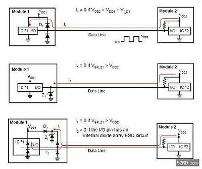 突崩式TVS二極管雖然擁有高突波規格,但相對較大的電容值使得這類元件成為負載切換開關與直流電源匯流排保護應用的較佳選擇,相反地,二極管陣列適當的突波規格與較小的電容值則較適用于高速資料連接線的保護,突崩式TVS與二極管陣列通??梢越换ナ褂?,但部份電路在選擇適合採用的元件時則需要經過仔細的分析。(圖四)描述了當存在一個電流可以透過資料線流經二極管陣列路徑時所發生的向后驅動問題,如果VDD2大于VDD1,那么資料連接線有可能意外地提供電源給模組1,這個情況可能會造成邏輯晶片的電源啟動問題,或是在斷電后模組1上指示燈被點亮的異常狀況。