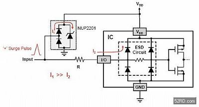 理想的外加TVS元件應該能夠吸收所有突波脈沖的能量,但是在實際上則不然,部分的突波電流能量可能會通過晶片內部的保護電路,一個限制電流流入內部保護電路的方法是使用一顆串接電阻,如(圖六)。雖然內部保護電路在避免組裝時發生ESD失效的表現上相當良好,但保護元件相對較小的尺寸則限制了它們承受正常產品使用情狀下所發生突波信號的能力,另一方面,雖然二極管的突波處理能力與體積成正比,但通常在晶片中整合較大型的保護元件并不實際。
