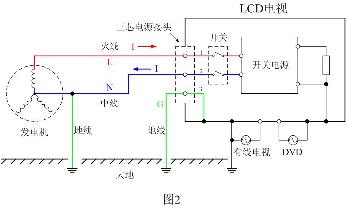 當(dāng)中線和地線互相接錯時,相當(dāng)于圖2中電視機(jī)的三芯插頭、座的2號線與3號線互相交換了位置。圖3就是電網(wǎng)輸電線的中線和地線互相接錯時,會引起三芯電源插頭的LCD平板電視機(jī)發(fā)生起火故障的工作原理圖。