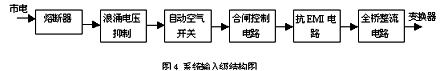 在開關整流模塊中,輸入級的結構如圖4所示。從圖中可知,此部分主要由熔斷器、浪涌電壓抑制電路、自動空氣開關、合閘控制電路、抗EMI電路等組成。