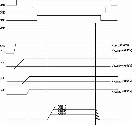 順序上電模式則根據設計者的要求,順序打開/關閉每一個通道。如果出現故障情況,則所有通道會被同時關閉,圖4是順序上電模式時序圖。