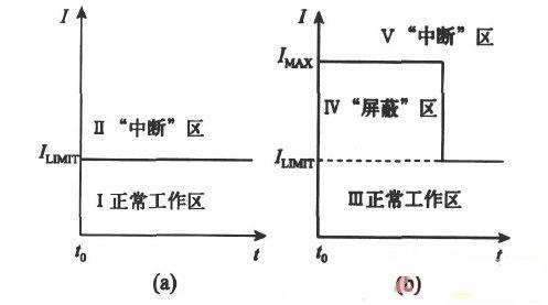 當負載電流超過限制電流ILIMIT 不太多且持續作用時間不太長時,我們希望過流保護電路能保持LDO 不中斷工作,因此需要采用“屏蔽”模式屏蔽掉部分可以讓LDO 不中斷運行的過流信號,對于過流幅值和持續作用時間超過范圍的過流信號,過流保護電路又能采取中斷LDO 工作的模式。傳統的“中斷”模式電流保護電路工作狀態如圖1(a)所示,分為正常工作區Ⅰ和“中斷”區Ⅱ,當負載電流不超過ILIMIT 時,LDO 工作在正常工作區,當負載電流超過ILIMIT 時LDO 進入“中斷”區。加入“屏蔽”模式后的過流保護電路工作狀態如圖1(b),分為正常工作區Ⅲ、屏蔽區Ⅳ以及中斷區Ⅴ,當負載電流小于ILIMIT 時,LDO 處于正常工作區,當過流信號的幅值在ILIMIT 和最大幅值電流IMAX 之間,持續作用時間在t=tMAX 之內即同時滿足ILIMIT ≤ ILOAD ≤ IMAX,t ≤tMAX 時,LDO 進入屏蔽區,這個范圍之外的過流信號將進入中斷區。對比圖1(a)和(b)可以看出,改進過流保護電路后的LDO 的正常工作區包括圖1(b)的正常工作區Ⅲ和“屏蔽”區Ⅳ,增大了工作區的范圍,提高了LDO 的工作效率。