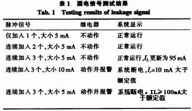 為了測試需要,我們設計了一個信號源,可以按照系統檢測信號的要求產生脈沖信號,以脈沖信號來模擬漏電信號。設定緩變電流動作值為100 mA,突變電流動作值為8 mA,當緩變電流累計值達到90 mA時,測試結果如表1所示。
