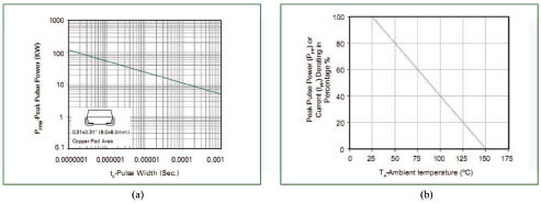 圖3 Littelfuse 5.0SMDJ15A TVS(a)峰值脈沖功率與脈沖持續時間,(b)熱降額特性