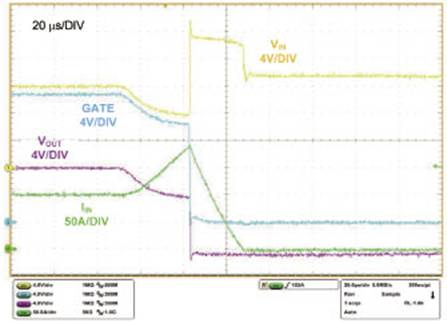 由于在檢測到故障之前允許建立起盡可能高的電流,圖1中電路的輸出兩端直接拉低的零阻抗短路尤其麻煩。在短路故障響應時間之后,通路MOSFET最終是由“斷路器”故障條件下的熱插拔控制器命令關閉的,同時正向電流迅速被中斷。