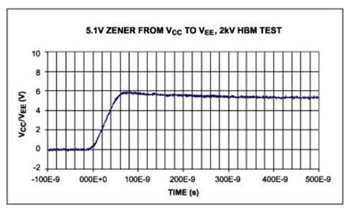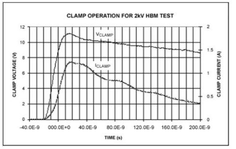 箝位二極管在IC其它電路遭到破壞之前導通,箝位管要有足夠的承受力,保證ESD電流不會導致二次擊穿。2kV HBM測試的箝位過程如圖5所示,圖5中的電壓包括I-R壓降和突變穩定后的箝位電壓。