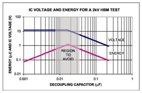 對于高速雙極型IC,HBM測試中吸收的最大能量是1μJ;2kV人體模式下,如果電容小于0.02μF(圖 6),C1>>C0二極管會產生動作。為了使去耦電容的能量低于1μJ,去耦電容有兩種選擇:要么容值大于0.05μF,要么小于 0.005μF。當使用更高的測試電壓時,要按比例增大0.05μF電容的尺寸。