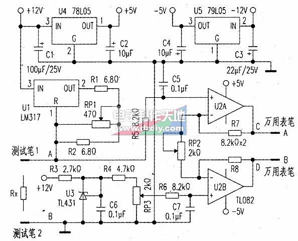 由運算放大器U2A和U2B及R7、R8、RP2(精密電位器)構成電壓放大電路,對被測電阻兩端的電壓進行10倍放大,這樣數字萬用表從C、D兩點測得的電壓值就可以與被測電阻RX的阻值相對應(1mV對應1mΩ,1V對應1Ω)。