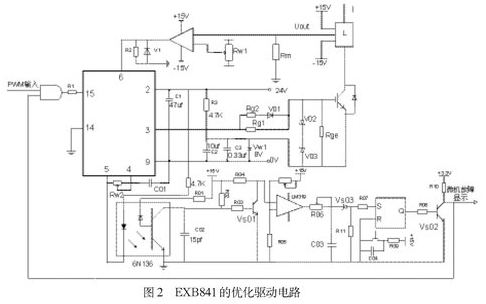 如圖2所示,用外接8V穩(wěn)壓管Vw1代替驅(qū)動(dòng)芯片內(nèi)部的穩(wěn)壓管Vz2,在穩(wěn)壓管兩端并聯(lián)了兩個(gè)電容值分別為105μf和0.33μf的去耦濾波電容。為防止柵極驅(qū)動(dòng)電路出現(xiàn)高壓尖峰,在柵射極間并聯(lián)了反向串聯(lián)的16V(V02)和8V(V03)穩(wěn)壓二極管。為了改善控制脈沖的前后沿陡度和防止震蕩,減小IGBT 集電極的電壓尖脈沖,需要在柵極串聯(lián)電阻Rg。柵極串連電阻Rg要恰當(dāng),Rg過小,關(guān)斷時(shí)間過短,關(guān)斷時(shí)產(chǎn)生的集電極尖峰電壓過高;Rg過大,器件的開關(guān)速度降低,開關(guān)損耗增大。優(yōu)化電路采用了不對稱的開啟和關(guān)斷方法。在IGBT開通時(shí),EXB841的3腳提供+16V的電壓,電阻Rg2經(jīng)二極管Vd1和Rg1并聯(lián)使Rg值較小。關(guān)斷時(shí),EXB841內(nèi)部的V5導(dǎo)通,3腳電平為0,優(yōu)化驅(qū)動(dòng)電路在IGBT的E極提供-8V電壓,使二極管V01截止,Rg= Rg1具有較大值。并在柵射極間并聯(lián)大電阻,防止器件誤導(dǎo)通。
