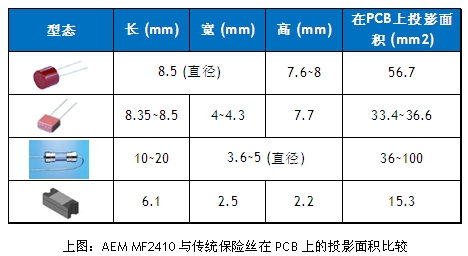 AEM科技研發(fā)生產(chǎn)的MF2410通用模塊式貼片保險絲體積只有6.1×2.5x2.1mm,與傳統(tǒng)保險絲相比,在PCB上的占用面積可以減少50-80%。