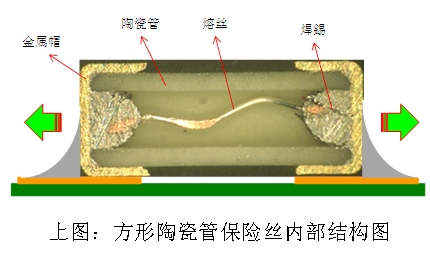 在市場上常見的2410尺寸125Vac或250Vac額定電壓貼片保險絲, 多是應(yīng)用傳統(tǒng)方形陶瓷管技術(shù)。這一類型貼片保險絲的兩端是采用金屬帽直接套在方型陶瓷管上, 再以焊錫將金屬帽與內(nèi)部熔絲焊接在一起。一旦產(chǎn)品在高溫的SMT產(chǎn)線上作業(yè),連結(jié)兩端金屬帽與內(nèi)部熔絲的焊錫極有可能會因高溫而再次發(fā)生熔融情形, 進(jìn)而導(dǎo)致金屬帽脫落的風(fēng)險。