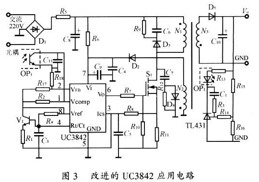 3)反饋電路改用TL43l加光耦來控制。我們都知道放大器用作信號傳輸時都需要傳輸時間,并不是輸出與輸入同時建立。如果把反饋信號接到UC3842的電壓反饋端,則反饋信號需連續通過兩個高增益誤差放大器,傳輸時間增長。由于TL431本身就是一個高增益的誤差放大器,因此,在圖3中直接采用腳1做反饋,從UC3842的腳8(基準電壓腳)拉了一個電阻到腳l,腳2通過R18接地。這樣做的好處是,跳過了UC3842的內部放大器,從而把反饋信號的傳輸時間縮短了一半,使電源的動態響應變快。另外,直接控制UC3842的腳l還可簡化系統的頻率補償以及輸出功率小等問題。