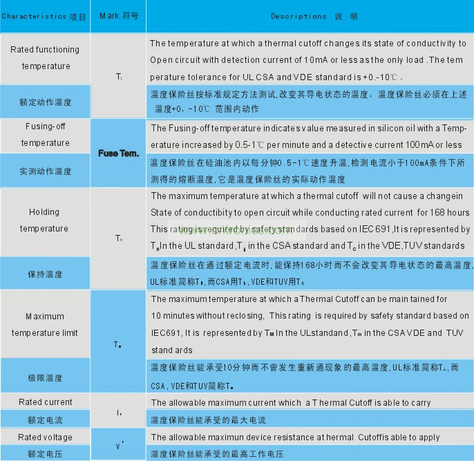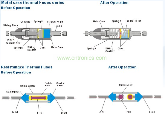 當溫度保險絲周圍溫度上升到它的動作溫度時,其易熔合金熔化并在表面張力作用下及特殊樹脂幫助作用下,收縮成球狀附兩引腳未端或保險絲內(nèi)彈簧的彈力推走電極作用,這樣電路被切斷