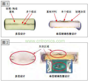圖1比較了SFF保險絲的多層設計與標準玻璃包覆設計。當熔絲斷開時,玻璃包覆設計僅依靠熔絲一側上的涂層吸收汽化熔絲材