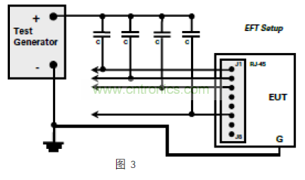 檢查設(shè)備的 EFT 免疫力(根據(jù) IEC61000-4-4 標(biāo)準(zhǔn)),與共模雷擊浪涌測試非常相似。在如圖 3 所示比較典型的配置中,所有的導(dǎo)體(或引腳)電容耦合到測試信號(hào)發(fā)生器的正極和“浪涌”到 GND。如果數(shù)據(jù)線幾乎沒有差別,線對(duì)之間很少有異模能量,但變壓器耦合電容會(huì)再次將共模能量以衰減的方式傳輸?shù)津?qū)動(dòng)端。