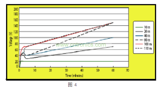 隨之而來的高能量放電可能會(huì)損壞連接器,變壓器電路,或以太網(wǎng)收發(fā)器。雙絞線電纜表現(xiàn)像一個(gè)存儲(chǔ)電荷的電容器。有研究證明,未連接到終端的雙絞線電纜可能會(huì)積累幾百伏的電荷。此外,在一個(gè)小時(shí)內(nèi),完全放電的電纜可以積累其所能積累總電荷的一半。一旦有了靜電,高品質(zhì)的電纜保留其所帶靜電的時(shí)間可以超過 24 小時(shí)。下面圖 4展示了不同長度的 CAT5 電纜積累靜電如何隨著時(shí)間而變化。由于較長的電纜有容量來存儲(chǔ)更多的電荷,電纜長度超過 60m 的系統(tǒng)應(yīng)采取額外的 CDE 預(yù)防措施。