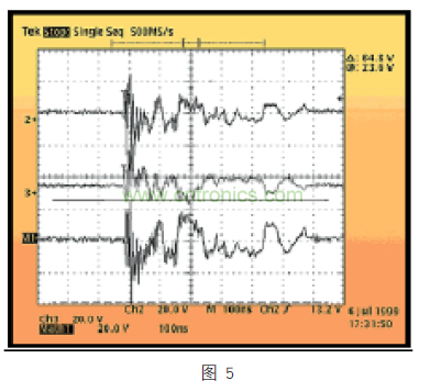 另一個(gè)要了解的重要因素是 CDE 波形,因?yàn)樗幌褚郧坝懻摰娜魏瓮{,取決于耦合機(jī)制,要么是異模,要么是共模。此外,初步研究顯示,它在特點(diǎn)上有很大差異,但總體上看,CDE 的波形能量高,體現(xiàn)在電壓和電流驅(qū)動(dòng)上。波形傳播的時(shí)間為幾百納秒,能夠快速反轉(zhuǎn)極性。下面的圖 5,給出了破壞性 CDE 波形的例子,在一個(gè)以太網(wǎng) PHY 發(fā)射器引腳,一個(gè) 25 英尺雙絞線電纜靜電電壓達(dá) 1.5KV。在該事件發(fā)生超過 600ns 時(shí)間的期間,在異模波形上看到有 64.8V 從正電壓轉(zhuǎn)換為負(fù)電壓。在這個(gè)實(shí)驗(yàn)中,PHY 的發(fā)射器被破壞,無法在網(wǎng)絡(luò)上傳輸數(shù)據(jù)包。
